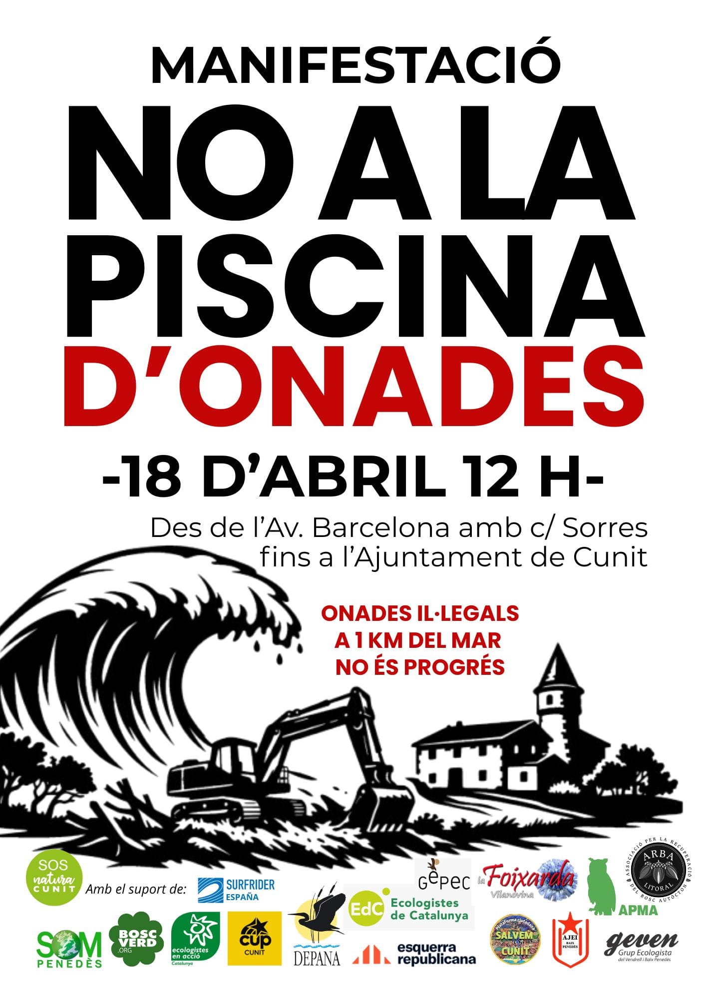 SOS Natura Cunit porta mesos mobilitzada contra el Wavegarden: al·legacions, presència als plens i una primera manifestació al desembre que va aplegar un centenar de persones. Dissabte 18 d'abril convoca la segona, a les 12 hores, des de l'avinguda Barcelona amb el carrer Sorres fins a l'Ajuntament.