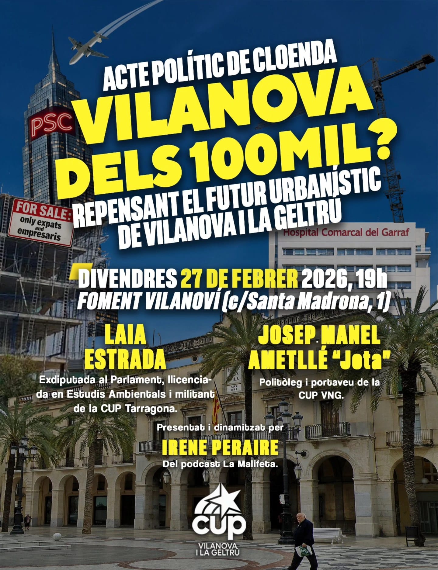 El 27 de febrer, Josep Manuel Ametllé «Jota», regidor i portaveu de la CUP a Vilanova, clausurarà el cicle amb un acte polític al Foment Vilanoví on presentarà les conclusions del debat acompanyat de Laia Estrada, exdiputada al Parlament i militant de la CUP a Tarragona. La pregunta que centrarà l'acte és la mateixa que ha plantejat la CUP des del principi: Vilanova dels 100.000 habitants? Una interpel·lació directa sobre si cal acceptar el creixement imposat o si la ciutat pot decidir el seu propi futur.
