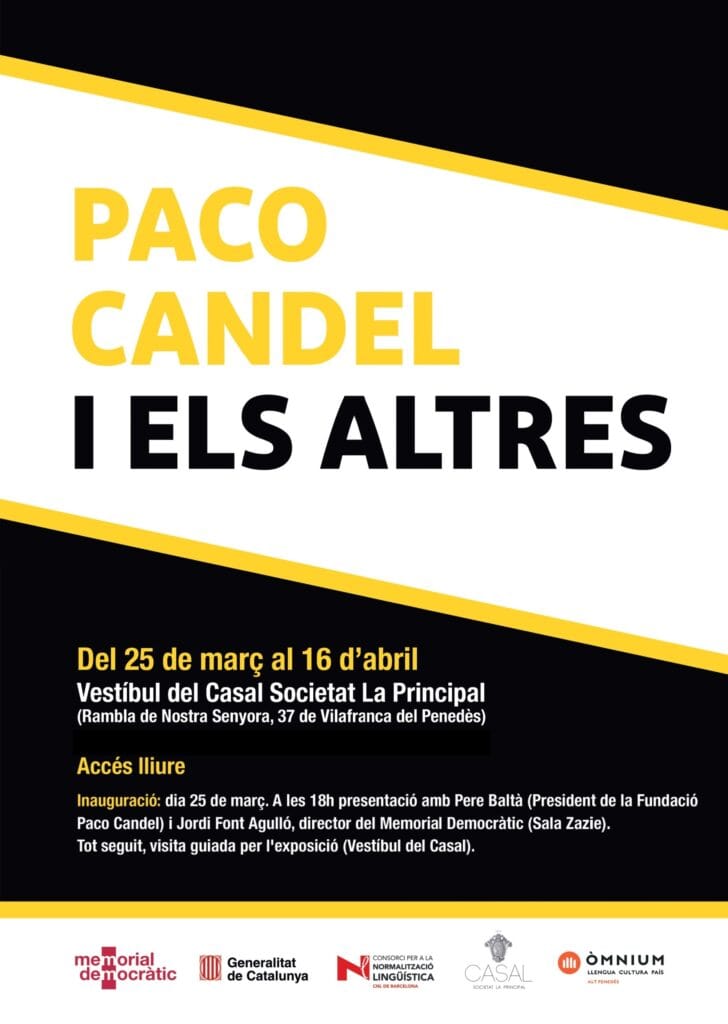 Del 25 de març al 16 d'abril, el vestíbul del Casal Societat La Principal acollirà l'exposició «Paco Candel i els altres. Un retrat literari de la immigració a Catalunya», que Òmnium Cultural Alt Penedès porta a Vilafranca. La mostra, produïda pel Memorial Democràtic, s'inaugurarà el dimarts 25 de març a les 18 h, amb la participació de Pere Baltà, president de la Fundació Paco Candel, i de Jordi Font, director del Memorial Democràtic.